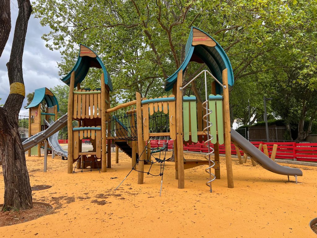 O novo design deste parque infantil aposta na ligação das crianças ao meio ambiente. Tendo como mote o conceito de uma “pequena vila de floresta”, foram instalados equipamentos em materiais naturais, como a madeira de robínia (mais resistente e duradoura), que incluem pontes de corda e redes para trepar. A intervenção contemplou igualmente a integração de equipamentos em forma de elementos da natureza: uma formiga, um caracol ou nenúfares.